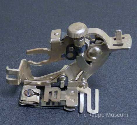 Metal hemstitcher attachment for Singer sewing machine. Hemstitcher attachment has a vertical hinge with arm and thumbscrew. Possibly made for Singer #121387 for featherweight machines.