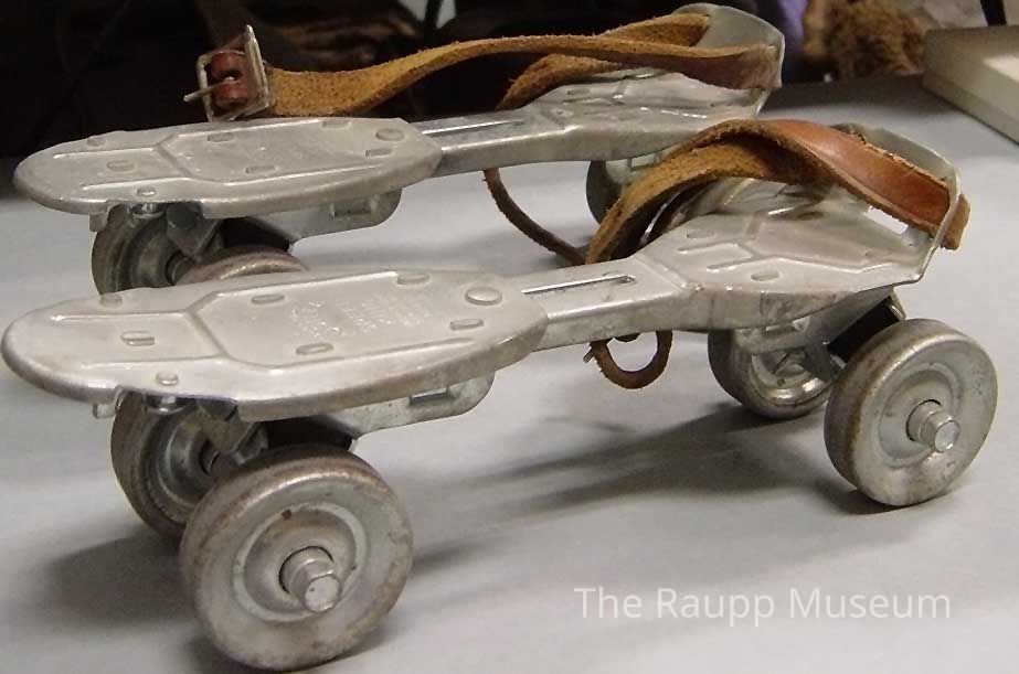 Pair of identical silver-color metal roller skates with leather straps. An example of a modern quad skate with a pairs of wheels set in both the front and rear of the skate. Flat footbed plate mounted to the tops of the axles. Straps have 12 holes punched through them to adjust the fit. The skates each have a screw that can be loosened to adjust the length of the footbed.Dimensions