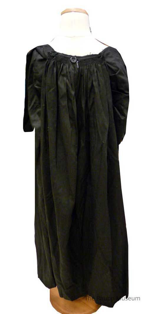 Long black pencil shaped skirt with ruffle at the back, satin-like fabric. With wrap around insert inside the skirt, snap closures and plastic buttons.