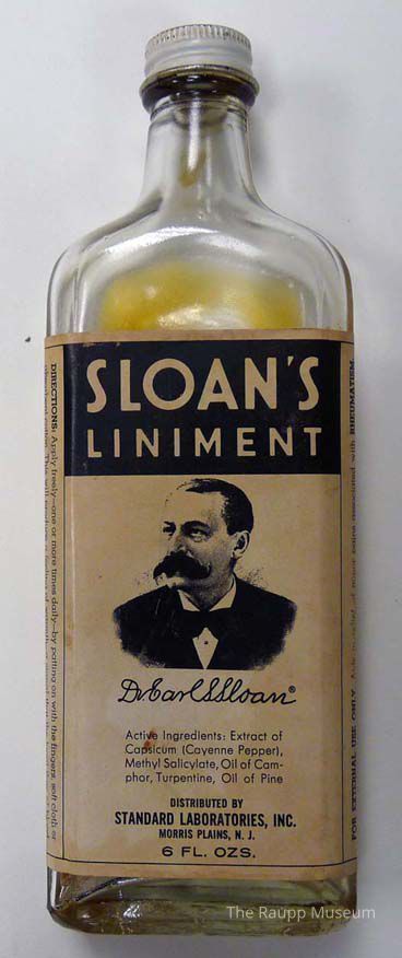 Clear glass bottle with rectangular shape with white screw cap. Glass has product's name embossed on back. Label is light brown with black text and image of Dr. Sloan. Contained amber-colored liniment for topical use to treat aches and pains. The liniment was a popular over-the-counter drugstore item. Likely a quality reproduction.