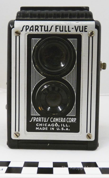 Box camera. Two lenses with set apertures mounted vertically on the front of the textured Bakelite box. Silver backplate mounted to the plastic around the lenses with text: "Spartus Full-Vue" across the upper center. Switch on the side used to select between time and instant exposures and a simple shutter with side mounted release. Finder lens is larger in diameter than its camera lens, yielding a bright finder image on the hooded matte screen panel on the top of the box that flips up.Dimensions