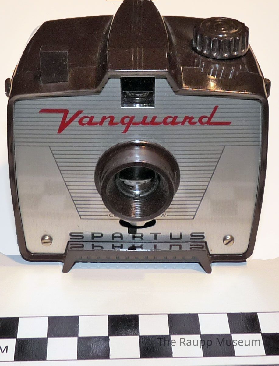 Brown plastic camera with silver metal face, instruction booklet and removable flash gun unit. With a fixed focus lens, positive action shutter, an aperture setting for color or black and white photos, and a built-in optical eye-level view finder. Flash gun had M-2 flash bulbs and two batteries. Missing carrying strap.