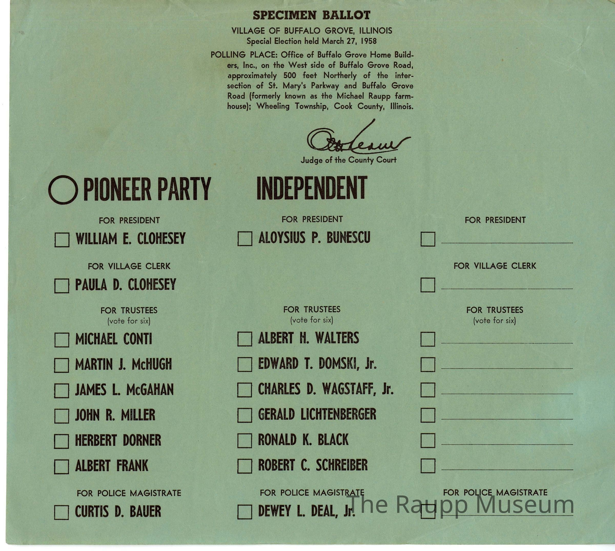 One (1) typed green square specimen ballot for the Village of Buffalo Grove Special Election, held on March 27, 1958. Contains information about the polling place on top, with three columns of candidates. There is the Pioneer Party, with individuals running for President, Village Clerk, Trustees, and Police Magistrate. There are Independents running for President and Trustees, and Village Magistrate; and one colum to write in candidates for each position on the right. The back is blank.Archive Items Details