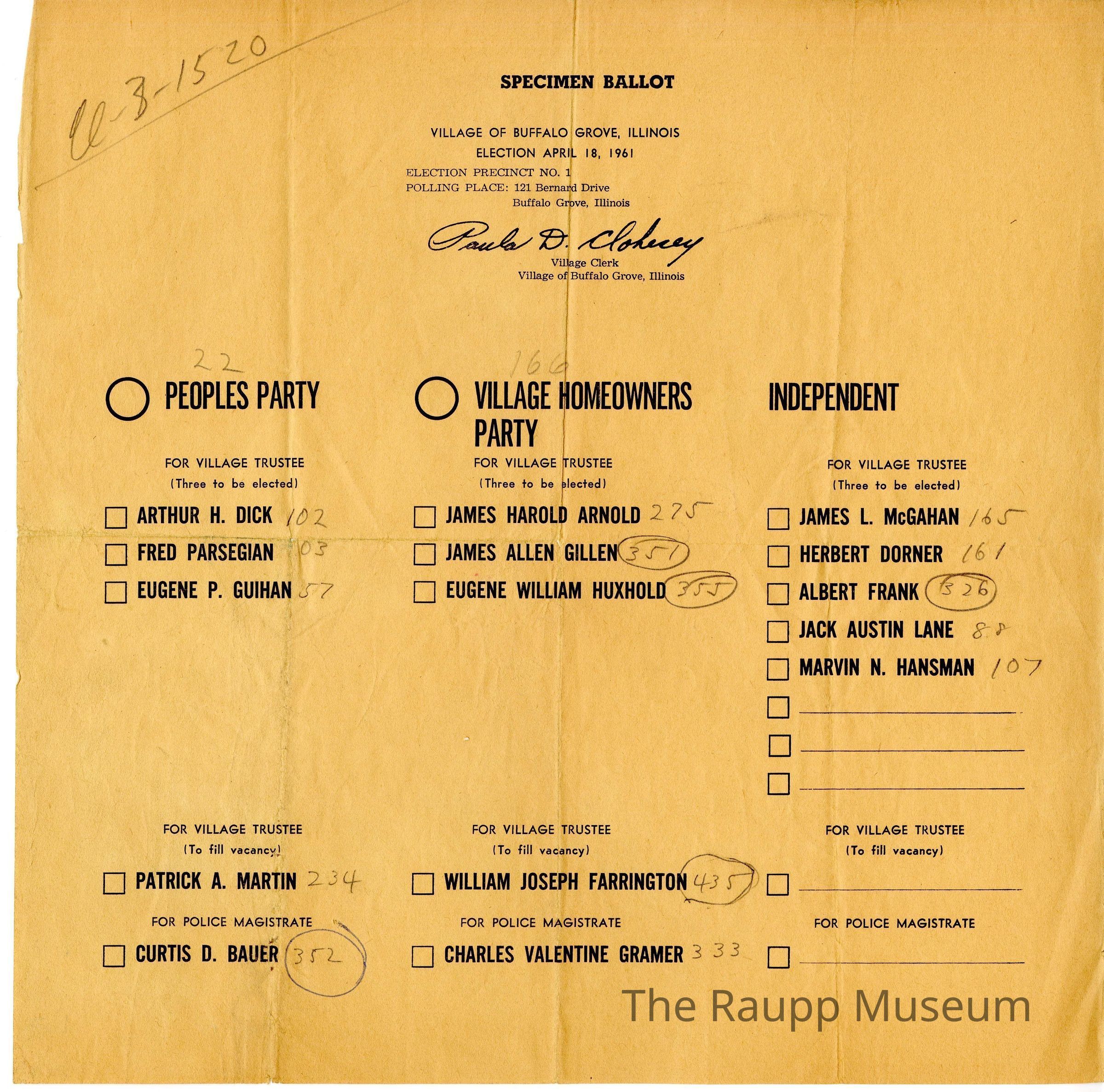 One (1) specimen ballot for the Village of Buffalo Grove election on April 18, 1961. There are three parties listed - the Peoples Party, the Village Homeowners Party, and Independent. There are positions vacant for Village Trustee, and Police Magistrate. This copy has numbers written next to each persons name (believed to be the voting counts for each candidate).Archive Items Details