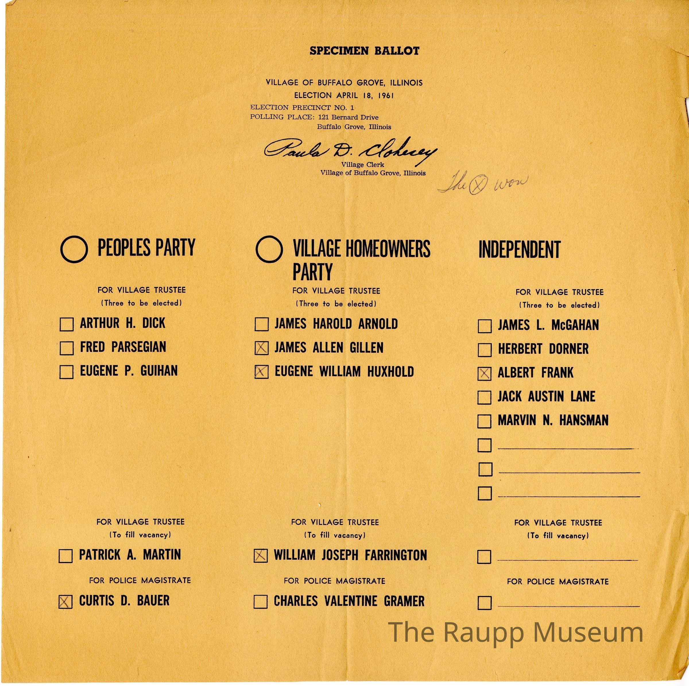 One (1) specimen ballot for the Village of Buffalo Grove election on April 18, 1961. There are three parties listed - the Peoples Party, the Village Homeowners Party, and Independent. There are positions vacant for Village Trustee, and Police Magistrate. This copy has a handwritten "X" to indicate who won.Archive Items Details