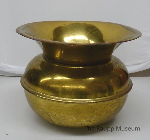 Round brass spittoon. Base has a squat, bulbous shape with flaired a three inch wide rim near top.