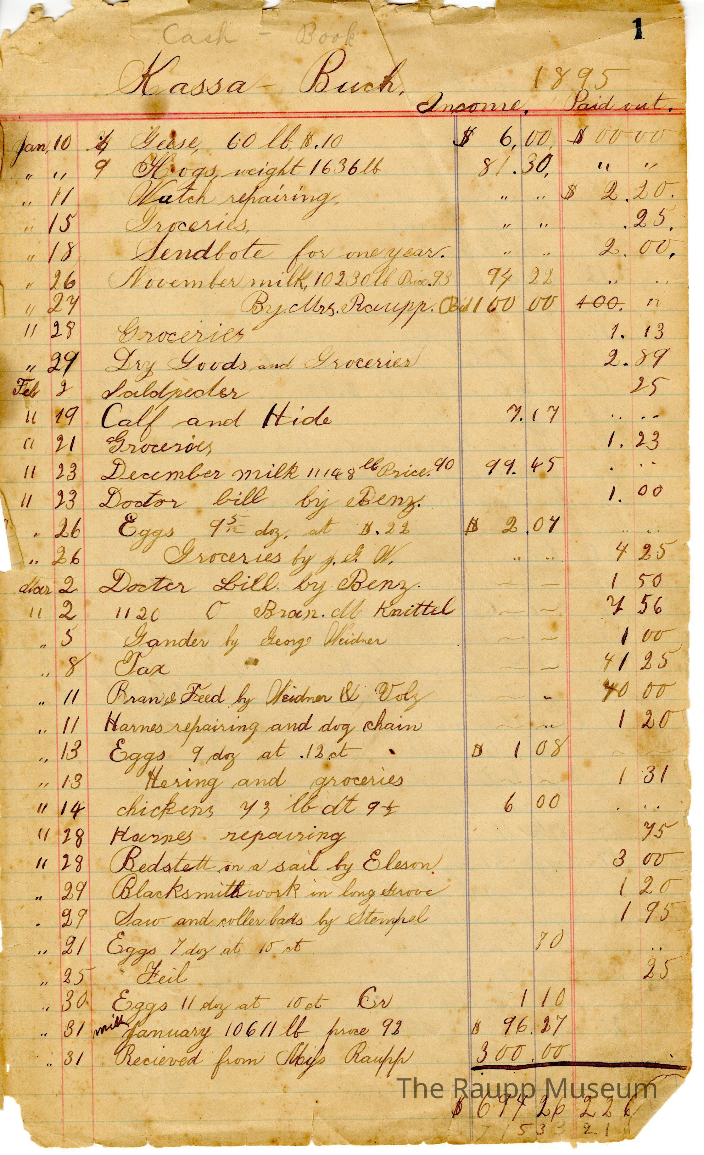 One (1) double sided paper cash-book for 1895, kept by the Spoerleins (presumed based on folder and other documents it is found with). Income and Expenses recorded between Jan. and May. Translation see attached excel file.