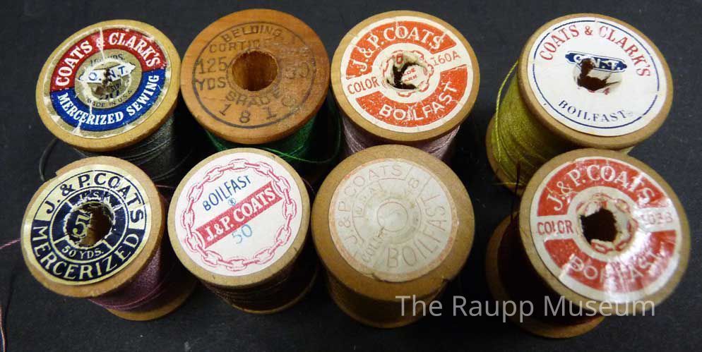 Group of eight colored thread spools with round adhesive labels on the tops and bases of spools. Brands: J. & P. Coats; Coats and Clark's Boilfast; Belding Cortigelli. Originally cataloged as UNNUMBERED-278 "miscellaneous from sewing machine drawer."Dimensions