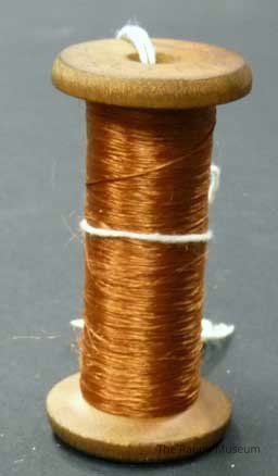 Tall wooden spool with light brown color silk thread. Faded handwritten: "Bin 655" on both ends of the spool.