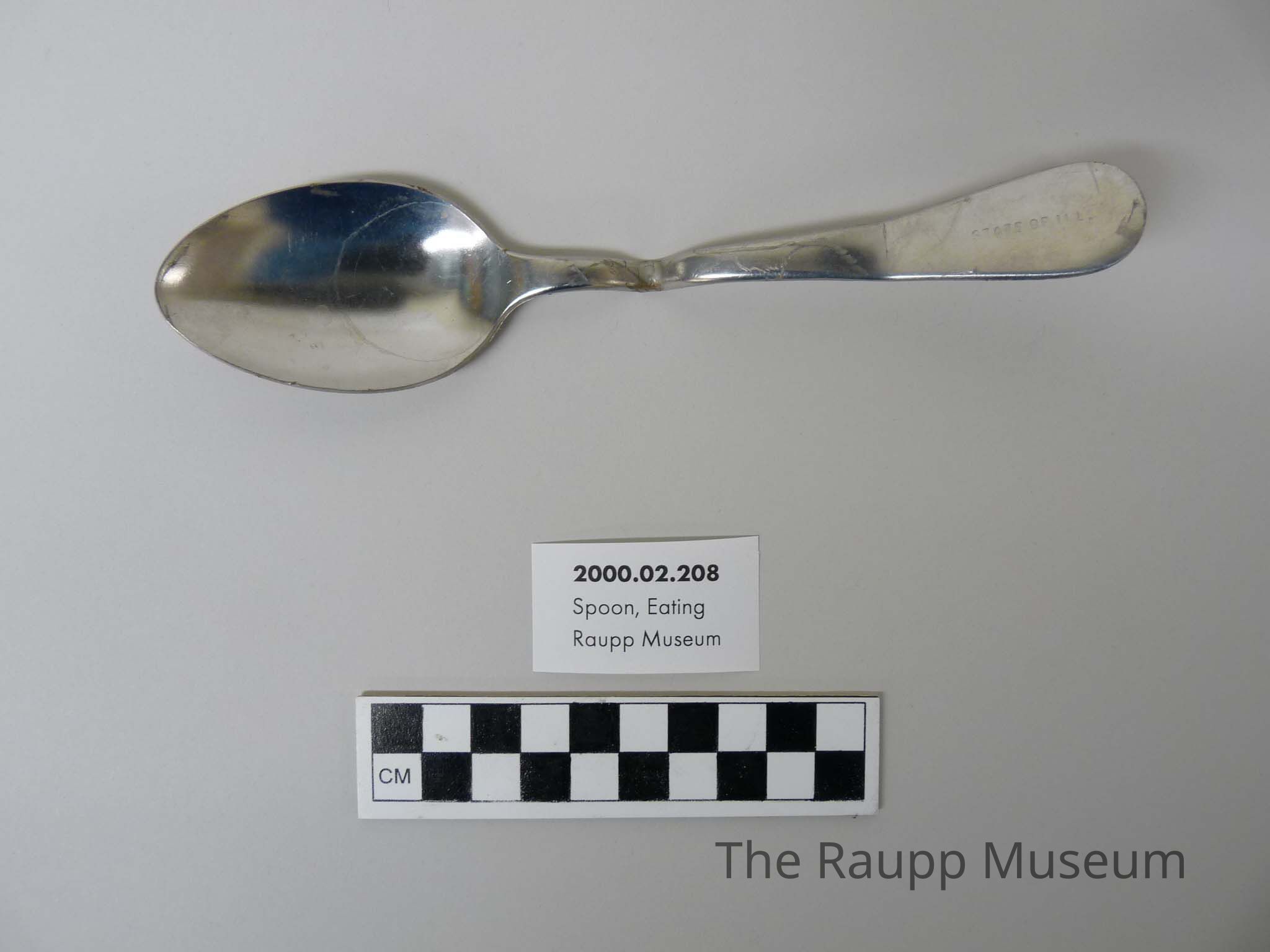 One (1) metal, silver stainless steel table spoon. "State of ILL" on front of handle and "Stainless" on back.