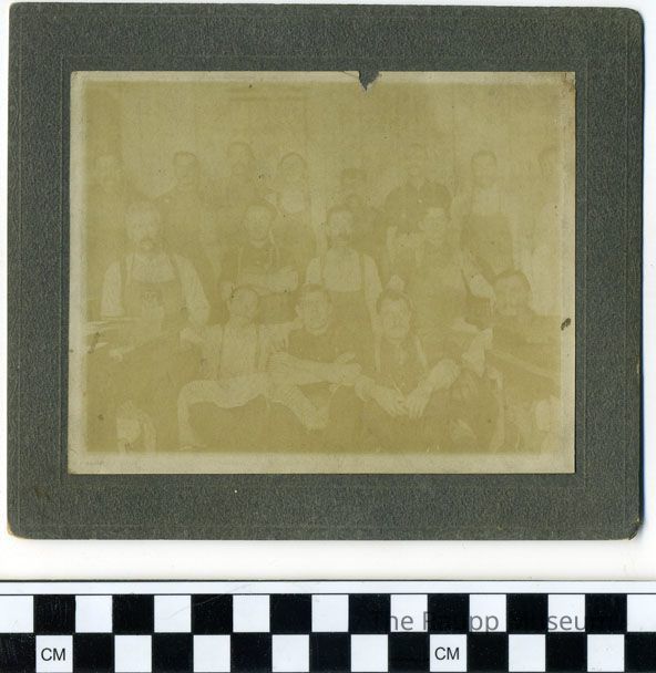 Sepia print with white border mounted to a heavy gray card. Card has embossed faux frame. Heavily faded and yellowed image of 16 men seated in three rows. Front row is sitting, the second row is standing, and the third row is standing on the riser. Many of the men are wearing overalls or aprons and have mustaches. Possibly documentation of St. Mary's School or Church construction?