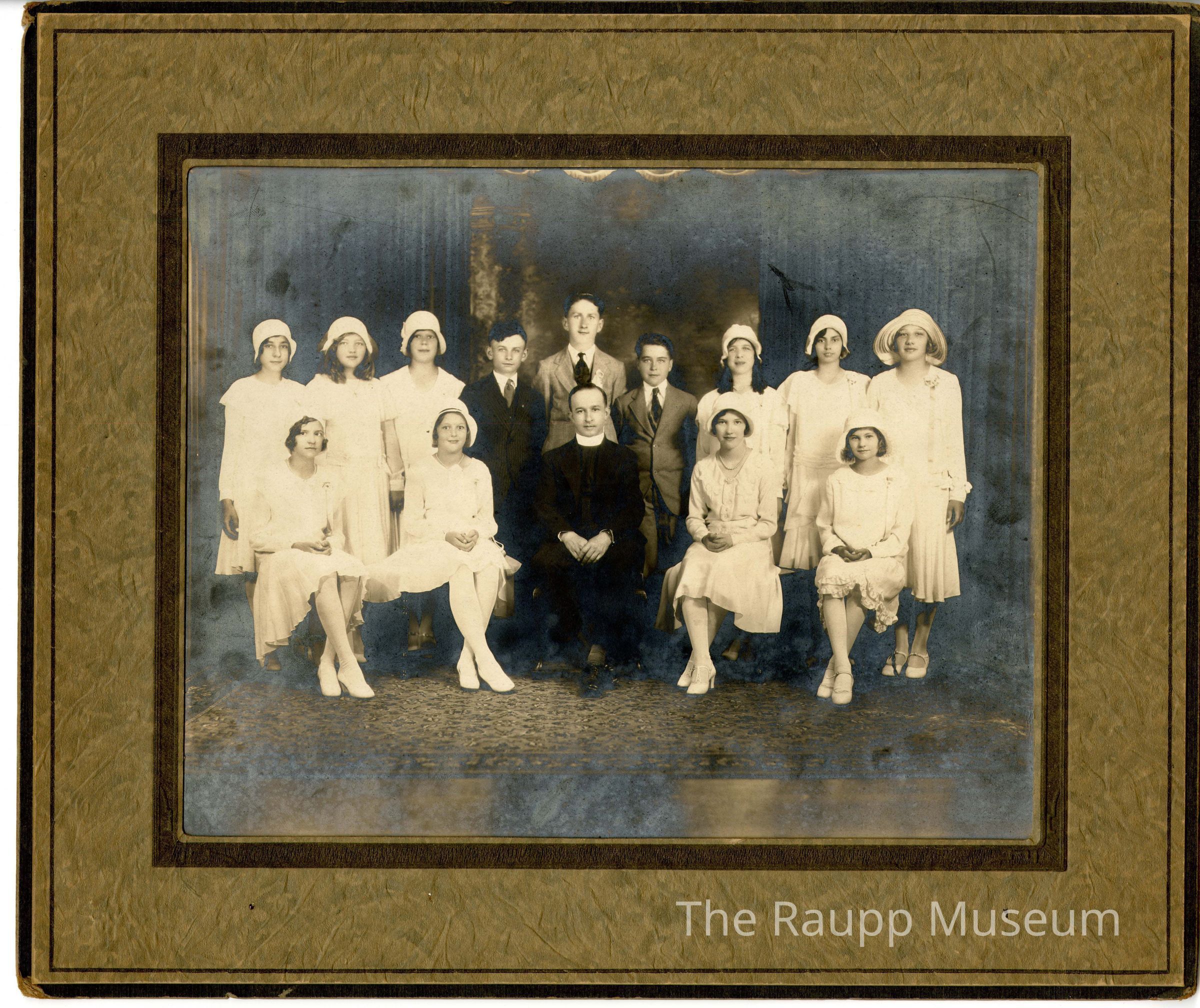 One (1) sepia-toned photograph of students and a priest. At the center is the priest, a man in a dark suit, sitting with the students next to and behind him. There are two female students seated on either side of him, and six female students, and three male students standing behind. The young women are dressed in light-colored dresses, light tights, and lights shoes, with white cloche hats. The young men have suits and ties in different colors. Photo has a painted blurred background and they are situated on a decorative rug.