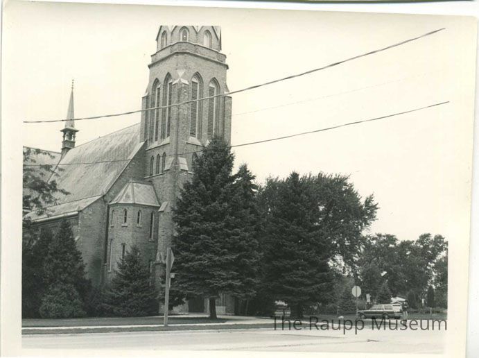 Black and white print with white border. Image of the exterior of St. Mary's Church with large trees blocking the view of the front. Two power lines run through the upper center of the image.Made/Created