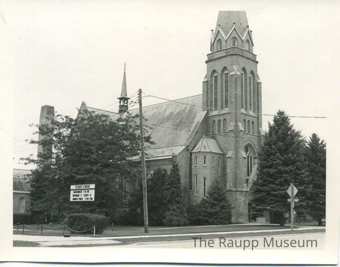 Black and white print with white border. Image of the exterior of St. Mary's church with large trees blocking the view of the front. Sign on the viewer's left outside of the church: "St. Mary's Parish; Aerobics T & Th women 7 coed 8; Bingo Tues 7.45 PM." Power lines run through the center of the image. Handwritten pencil text on the reverse.Made/Created