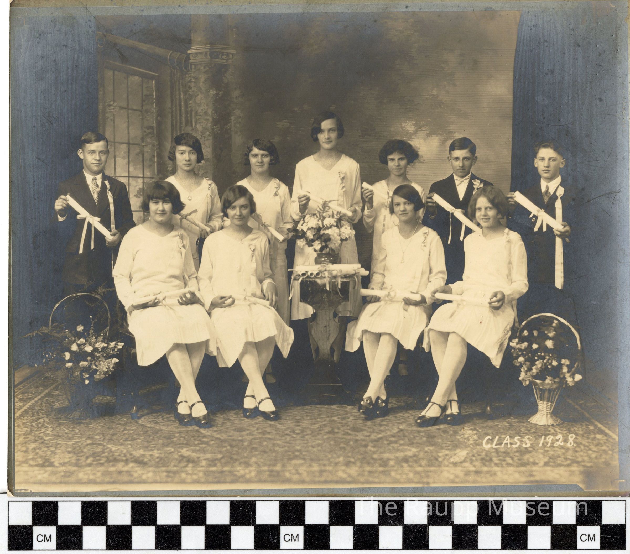 One (1) black and white picture of St. Mary's School Graduation Class of 1928. There are two rows of students, four girls seated in front with a small wooden table in the center (holding rolled diplomas and a bouquet of white flowers), and one boy, four girls, and two boys (left to right) standing behind them. The boys have on black suits. All individuals have shiny ribbons on their left lapel/chest and are holding rolled diplomas with ribbons around them. On both ends are baskets with flowers. There is a rug underneath them, and behind is a backdrop of a window and pillar and trees.
