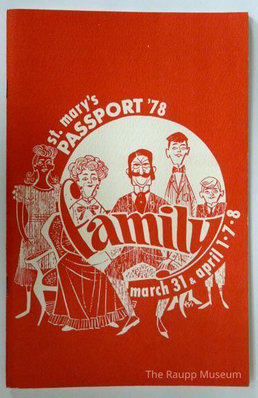 Soft cover booklet with side staple binding and red front cover with white circular illustration. Drawing of an early 1900s family sitting. Text: "st. mary's PASSPORT '78; family; march 31 & april 1 - 7 - 8." Text wraps around and through part of the illustration. reverse cover has a white background with red text advertisement for Hights Liquors in Prospect Heights.
