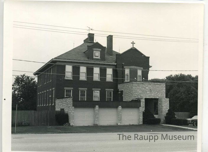 Black and white print with white border. Image of exterior of St. Mary's School. A three car garage underneath the square, two-story, brick building. Six powerlines hanging in front of the building. Handwritten pencil text on the reverse.Made/Created