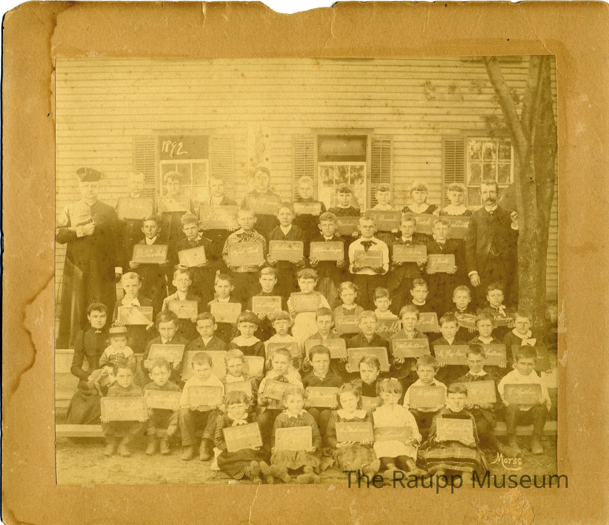 Black and white photo mounted to a tan card. Image of a group of about 50 St Mary's School students with Father Urth and Peter Weidner. Students are seated outdoors in six rows on bleachers in front of the building exterior. Each student holds a chalk board with their names handwritten on them. "1892" superimposed on left side window. "Moss" superimposed lower right corner.
