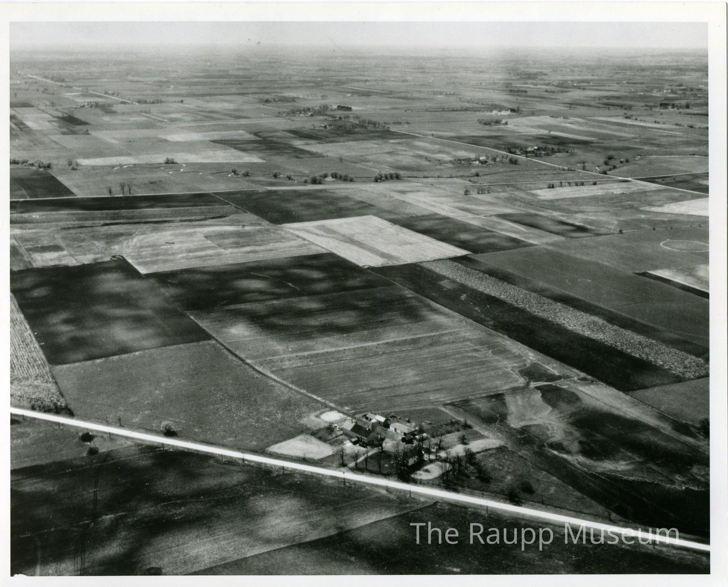 One (1) aerial view black and white photograph of Busch Grove circa 1946. Road in foreground is Rt. 83 and the farm on it belonged to the Stahl family. On the back handwritten in pen is: "1946 Irving and Lamina Stahl's Farm".Made/Created