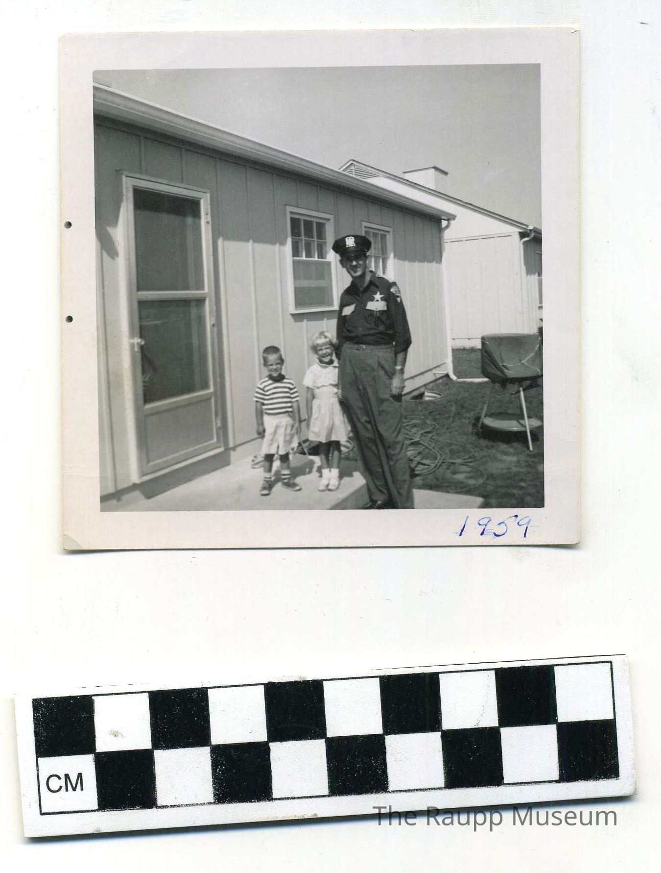 Black and white print with white border. Image of a uniformed police officer and two children standing in front of a Strathmore style home exterior on the front step. Barbeque grill with cover on the far right of image. Stanley Niezgoda is standing nearest the grill wearing a police hat, dark shirt with badge and baggy trousers. Girl standing in the center is wearing a light color dress. Small boy standing on the left of the image is wearing a striped shirt. Blue ink text "1959" located in lower right corner on the front. Image printed on Kodak paper, blue number "D09372" printed on reverse side in upper left corner.Made/Created