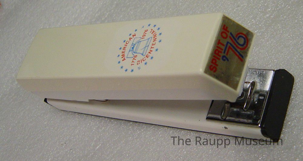 One (1) ACCO metal paper stapler for standard size staples. Stickers for the USA bicentennial affixed on the top (American Bicentennial 1776-1976) and no the front side (Spirit of '76). Tan colored with red and blue stickers. Marks include: "ACCO Stapler #50", "Use only genuine ACCO Standard Staples", "ACCO International, Inc. Chicago 60830 Made in USE".Dimensions
