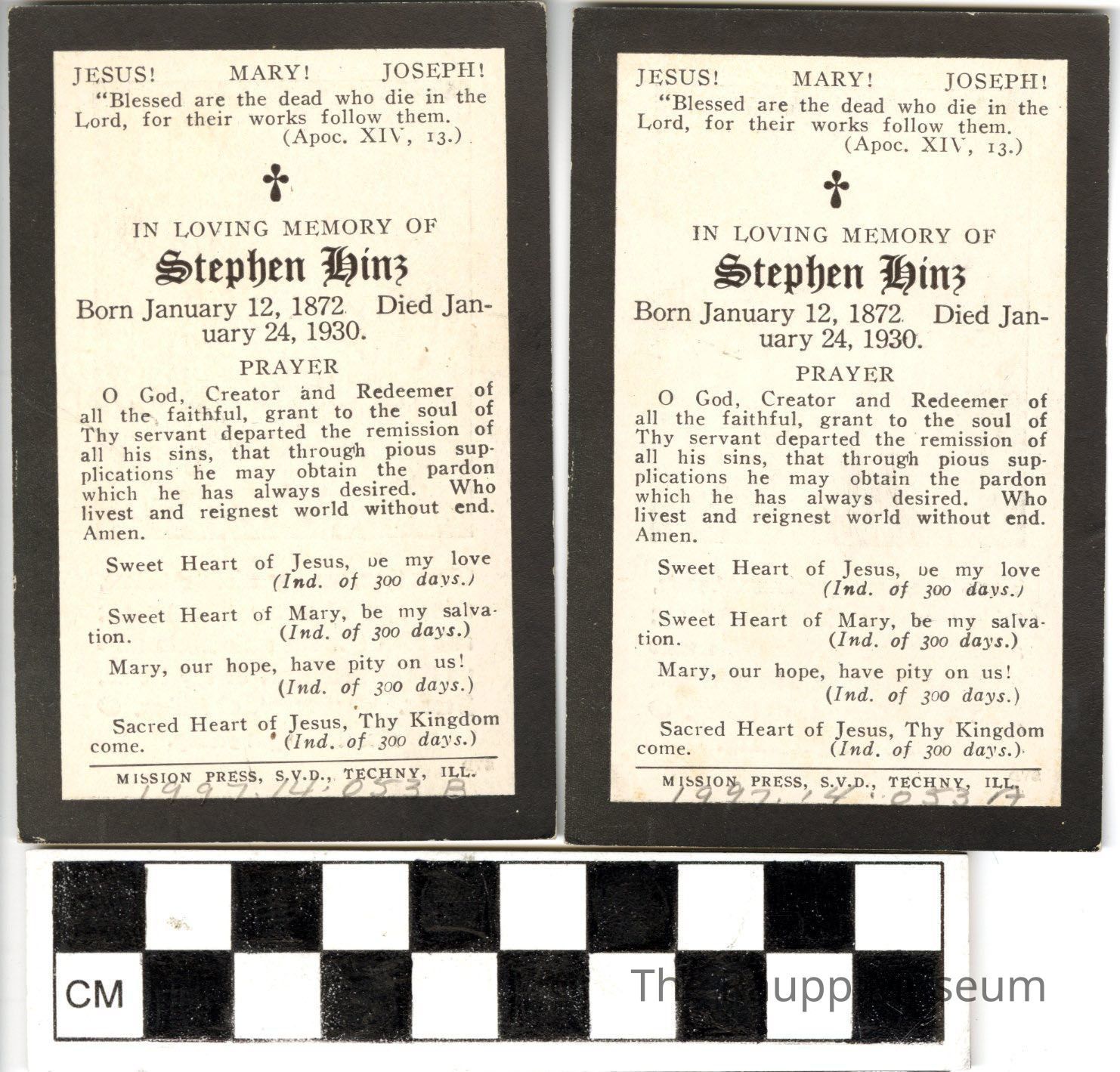 One (1) mourning prayer card for Stephen Hinz., born January 12, 1872, died Jan. 24, 1930. One side of the card has scripture reading with a prayer and information about Stephen. The front side of the card has a picture The Virgin Mary praying in a white and black cloak with a halo. There is another prayer printed underneath her.