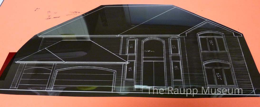 Group of sixteen black semi- transparent films of the exterior elevations of the model Sterling Creek homes with pink paper framing each film.Archive Details