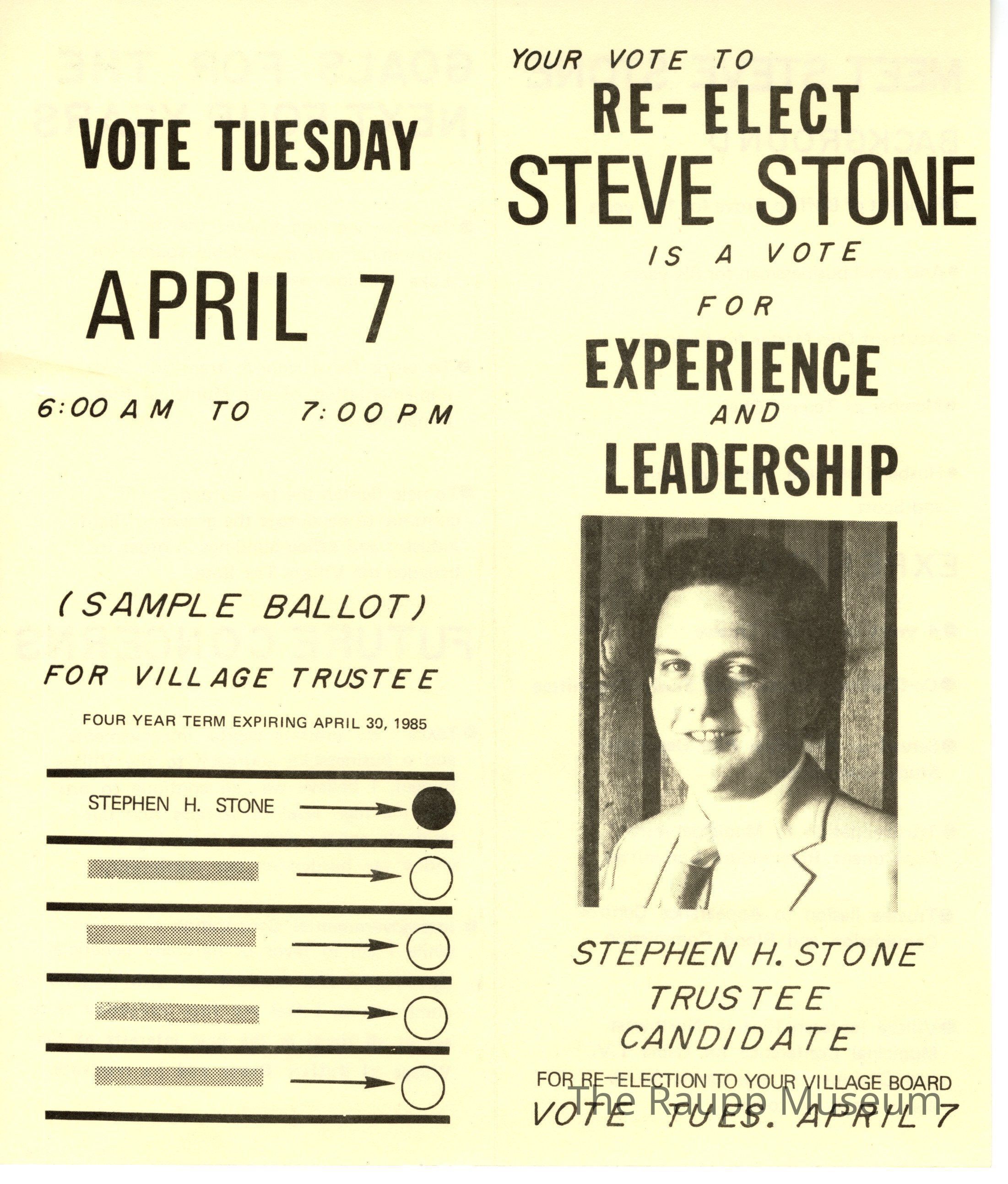 One (1) election pamphlet, yellow, for Steve Stone to village trustee. Is rectangular with four pages, b/w photo on front and experience listed inside.