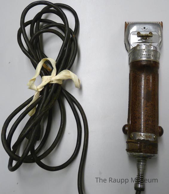 Animal clippers in a cardboard box. Clippers have rounded edged rectangular silver metal head with wing nut on top, toothed metal comb base. Engraving on the top of the clipper head: "oil here" with a hole and: "Stewart Clipmaster oil here model 51." Cylindrical body with brown paint, possibly enamel or plastic covering. With textured side panels, and switch near black plastic covered two-prong cord. Rusted name plate near base attaches with screws: "made in United States of America patents pending volts 110-120 watts 50, model 51-1." With metal coil wrapped around the cord near the base of the clipper.Dimensions