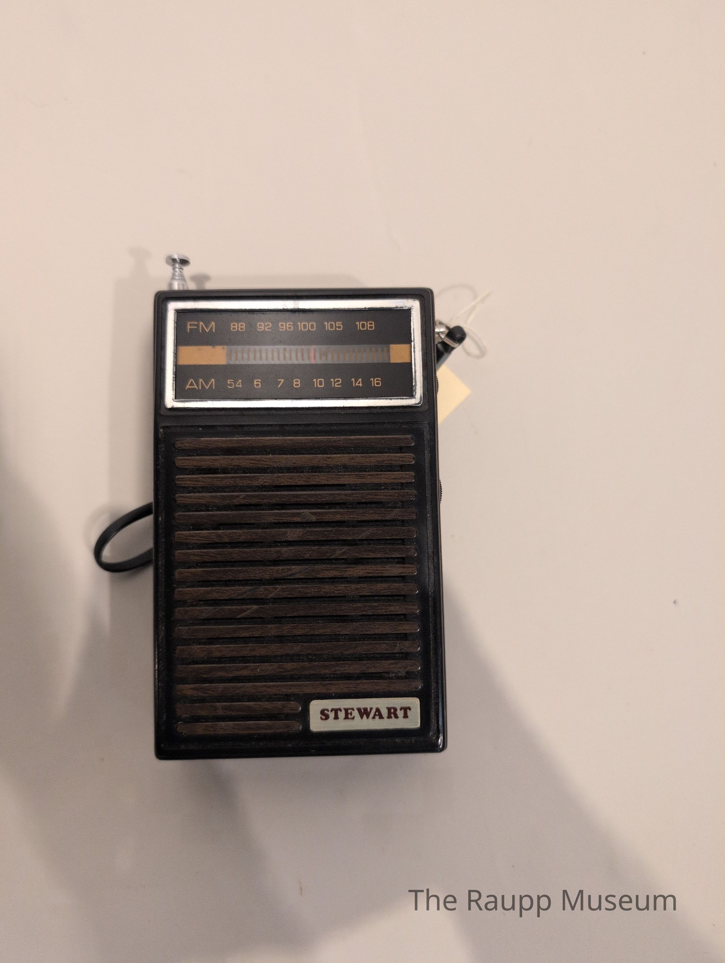 One (1) brown and black portable Stewart radio. The radio is made of plastic and metal. It is rectangular. On the front is a FM and AM bar with a red knob to determine stations, and underneath is a square brown slated area where sound comes out. In the bottom right corner is "STEWART" label. The top left corner on top has a silver metal attena that can extend outward and collapse. The back is back and in the center is a AM-FM switch. There is a sticker with white text that states: " STEWART Model No. TR.A/W". Embossed in black plastic is the text: "Certified to comply with FCC rules. Part 15. in effect as of date of manufacture. Pat. Pend." The bottom has "TAIWAN" in the right corner, and "LAR" in the left. On the right side of the radio are two circular knobs. There is a black plastic handle on the top right side.Dimensions