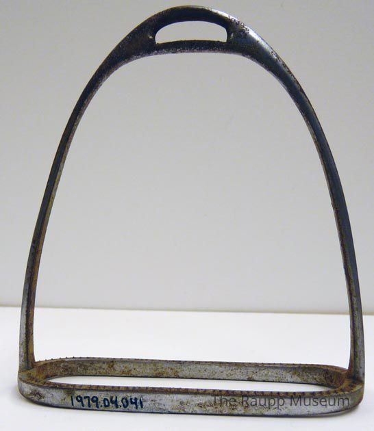 One (1) silver metal triangular shaped Fillis style English stirrup. This object is a one piece molded cast and has a rounded bell shape with tapered top and hole for attaching to saddle. Foor base has an oblong metal ring design with perforations along the top. This object is directly labeledDimensions