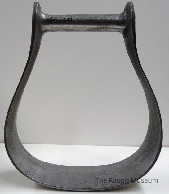 One (1) silver metal stirrup. This stirrup is a western style and is a one piece mold cast with a rounded U-shape and a tapered top.Dimensions