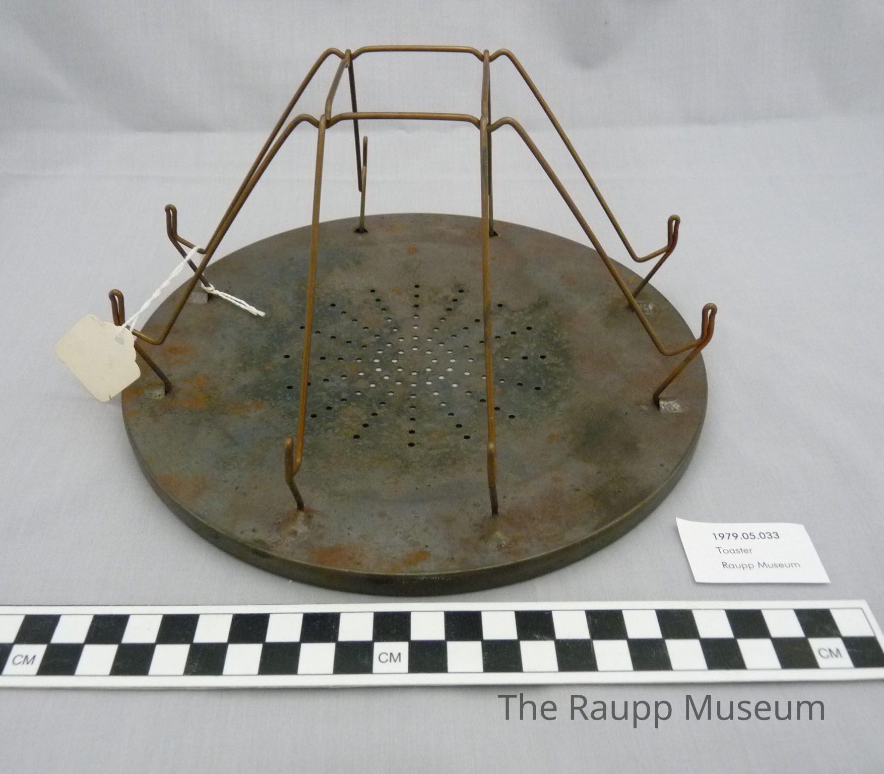 One (1) silver tin stovetop toaster. Made with heavy tin, has round base which would fit over stone burner and four wire toast supports which would interlock to support the toast, like sides of a pyramid. Toaster base is perforated with holes in an asterisk pattern to allow heat to come. Marks include: "MADE IN CANADA" printed near edge.Dimensions