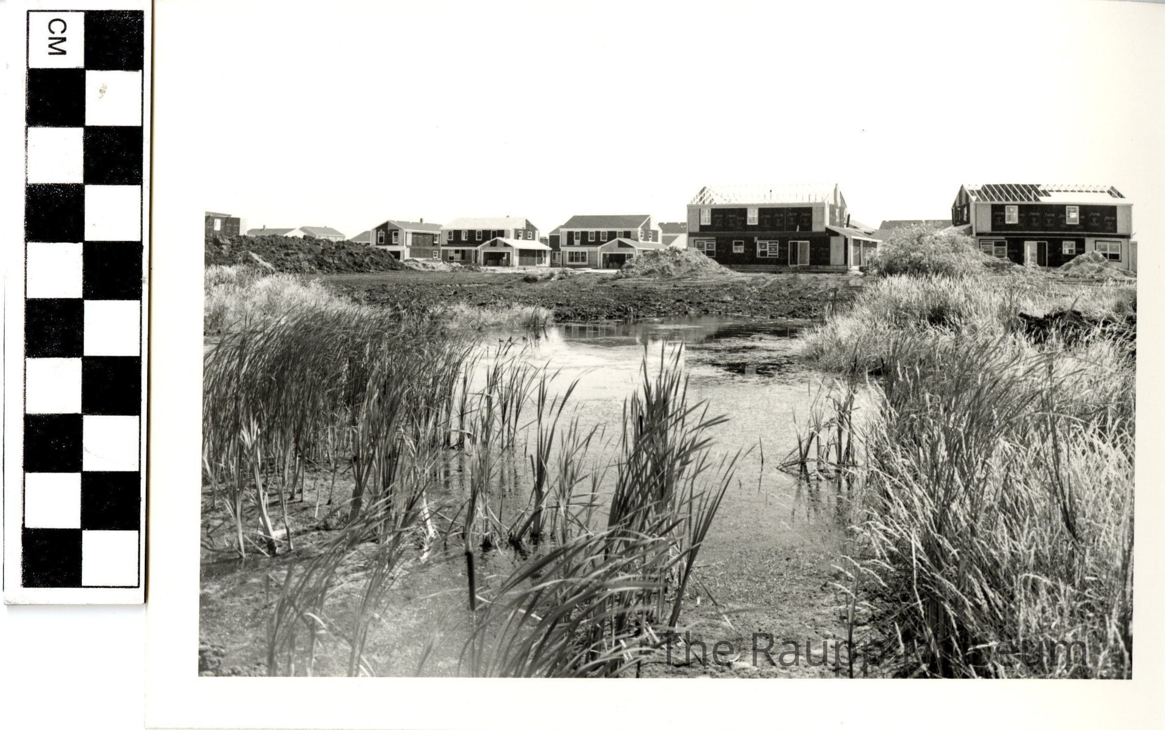 One (1) black and white photograph of a subdivision development, with a focus on a pond with reeds around it, and houses being built in the background. Similar angle to 2019.02.065B.