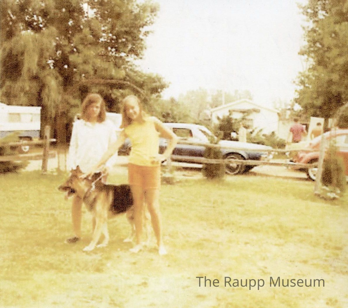 One (1) color photograph of Sue and Sally Hoffman with dog "Rex" standing "near hidden lakes pond, Buffalo Grove, IL (Hoffman Farm). July 1971". The back of the photograph has where the photo was taken and who is in the photo handwritten in black ink. There are three cars in the background, and two men walking away. There is a white house behind the cars. One individual has on a white shirt, and the other has a yellow shirt and orange shorts and is holding the dogs leash with her right hand.