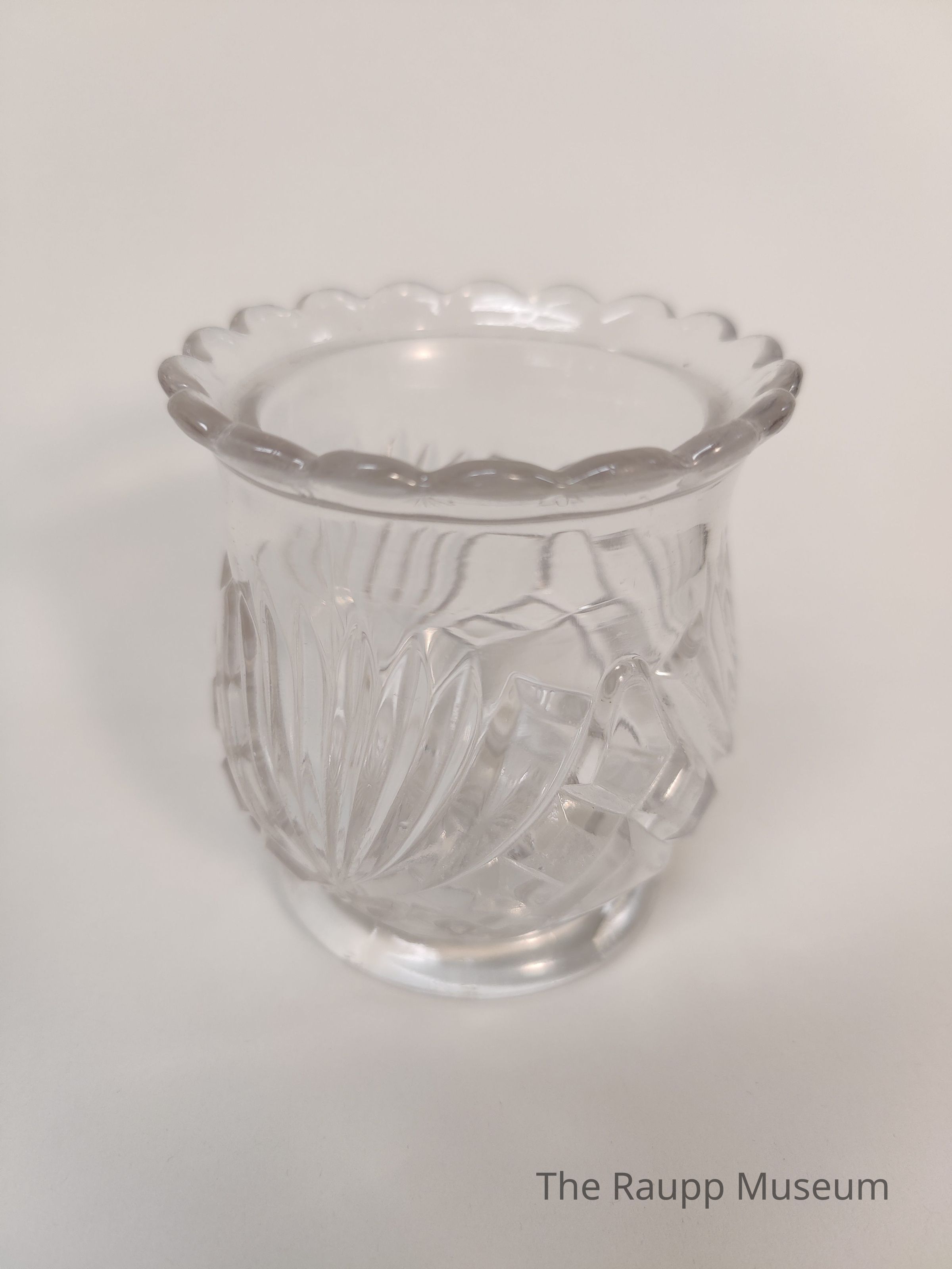 One (1) glass sugar bowl. Clear glass with a flared mouth and scalloped trim. Three (3) fan designs with five (5) long, narrow leaves and a wide leaf on each side engraved around body. Between each fan is a ribbon-like design of three squares arcing up to a point and then three squares arcing down. Embossed. Engraved rosette on base. Ring base.