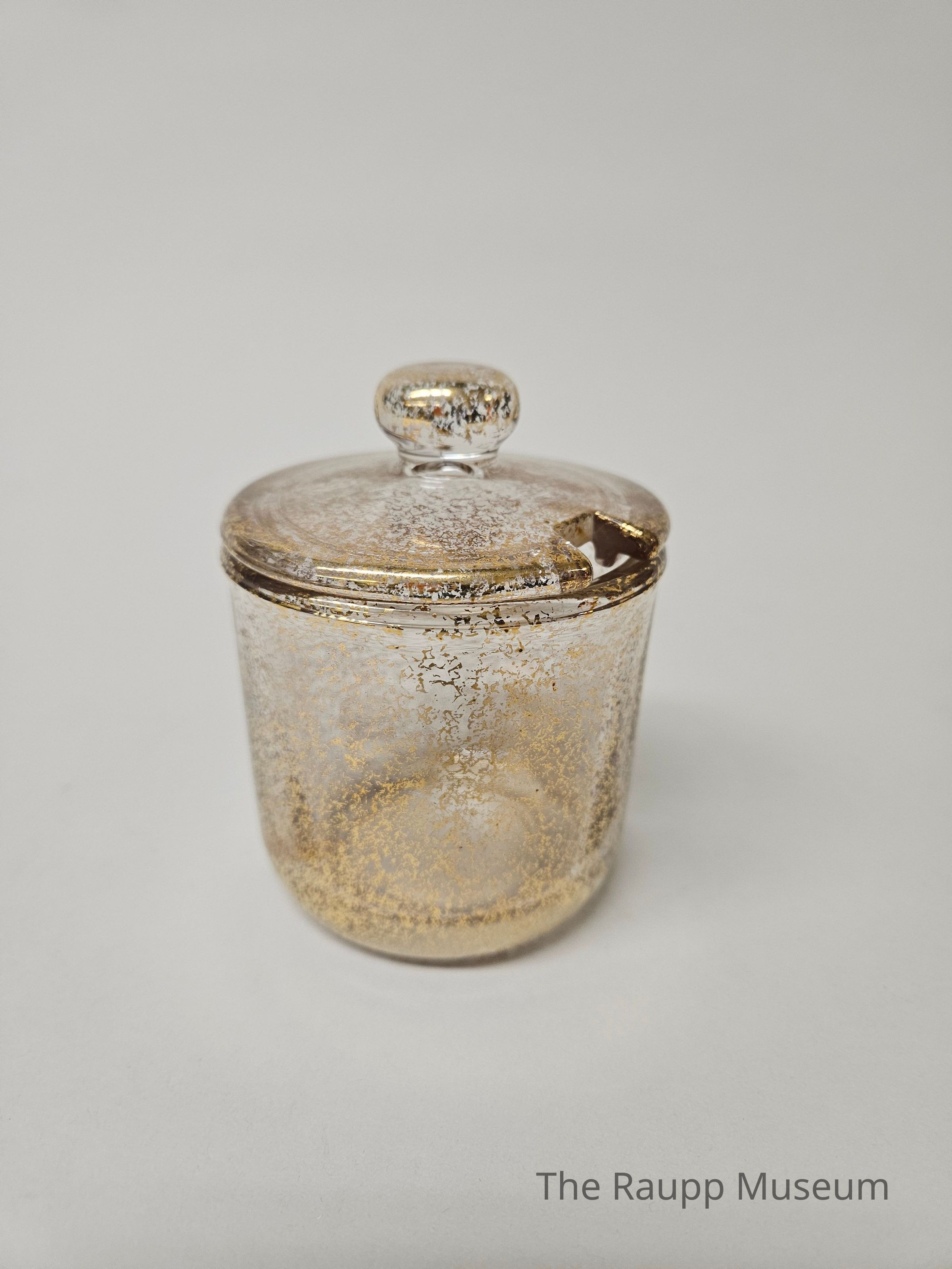 One (1) glass sugar container, round, with matching lid. Sugar dish is round with gold freckled design throughout. There is a "J" in a square embossed on the bottom. The lid has a round knob on top and a square opening on one edge for a spoon to sit.Dimensions