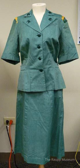 Green Girl Scout adult suit. Suit shirt has short sleeves, adjustable side tabs, and four plastic button closures down the front and on the collar and lapels. Matching skirt is A-line shape with a button closure at waist. All buttons have an embossed Girl Scout shamrock logo in the center.
