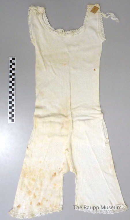 Girls white cotton union suit undergarment. Has a draw string neck with a lace a weave pattern accent. Legs have an 1 inch lace ruffle. Reverse side has a flap with three button closures. Hole on either side of the hip area.