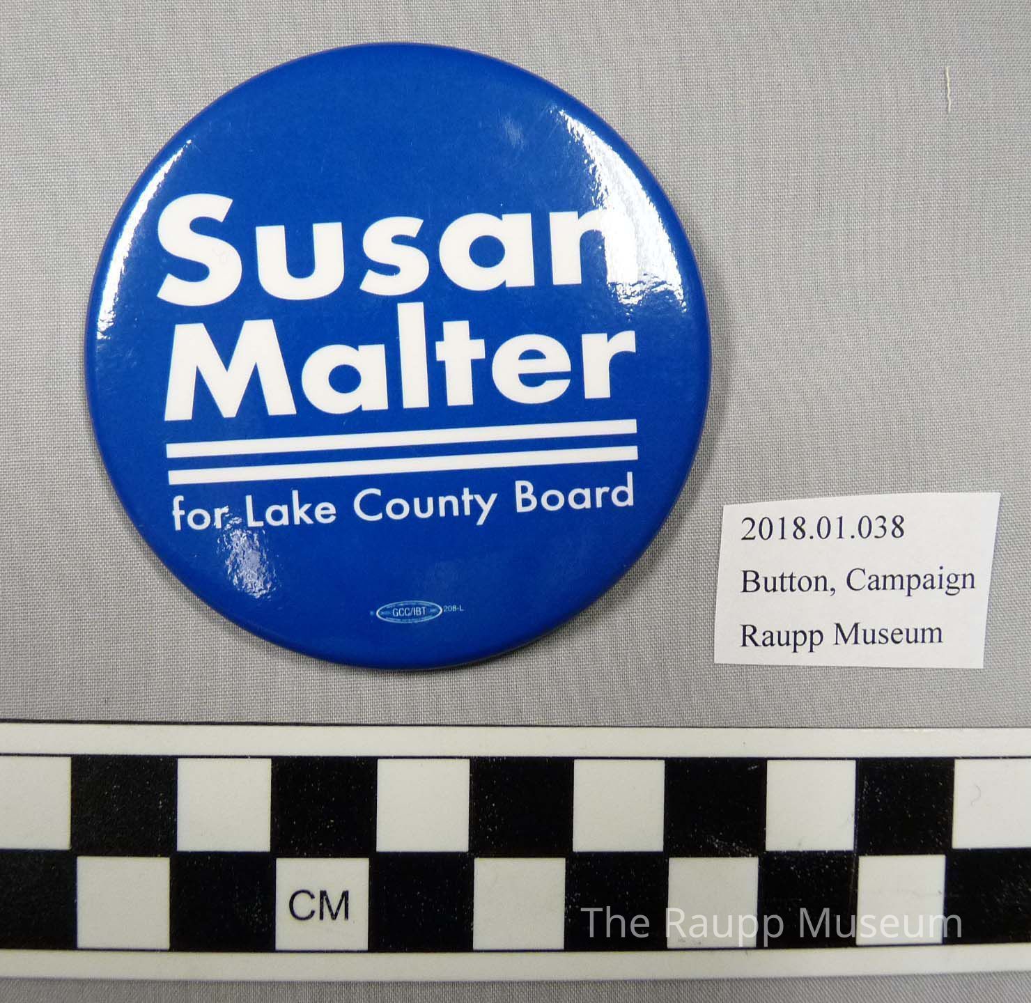 One (1) political button. The button has the text "Susan Malter for Lake Country Board" on one side, and silver metal on the back side. The button is white and blue. There is a safety pin affixed to the back.Condition