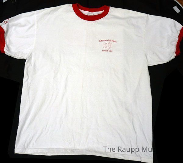 Buffalo Grove Park District summer camp t-shirt. Early 2000s retro design looks like a shirt used in 1986. White, size XL t-shirt with red collar and cuffs; red "Buffalo Grove Park District Summer Camp" text and sun logo on the left side of front. Reverse has screen-print red text: "STAFF." Left sleeve has a red smiley face sun logo with "S.M.I.L.E" underneath.Condition
