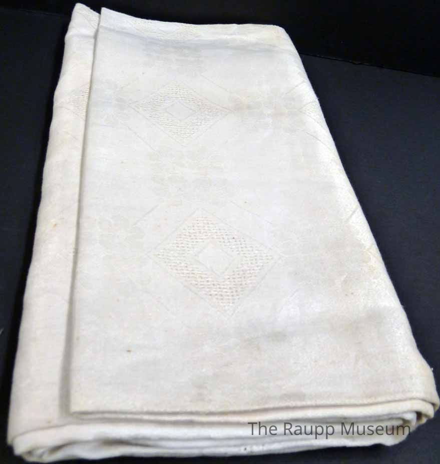 Linen tablecloth with monochromatic embroidery of diamond and floral patterns. With a hemstitch around the perimeter and within the embroidery pattern. With creases at folds and slight discoloration.Dimensions
