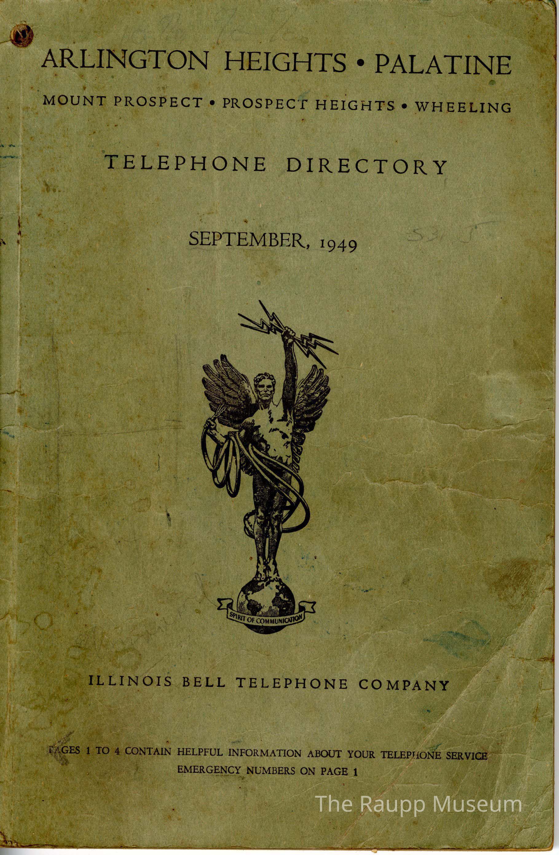 One (1) telephone directory for Arlington Heights, Palatine, Mount Prospect, Prospect Heights, Wheeling for Sept 1949. The cover is a green cardstock with a drawing of an angel man holding lightening and a cord in his hands with "Spirit of Communication" on the world he is standing on. There is a hole in the top left corner all the way through. Pages are brown with black text. There are handwritten notes of important numbers on the first few pages. There are 120 pages.