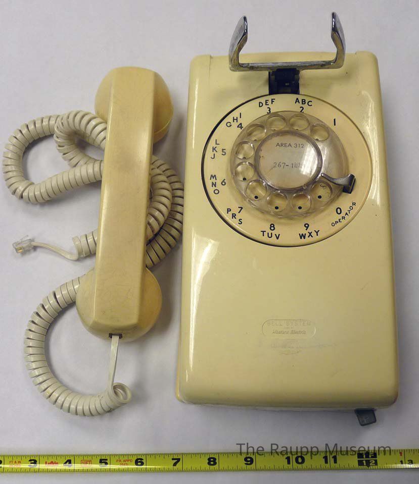 Wall mounted plastic telephone. Three piece set: receiver and cord (part 2/3), plastic back mount (3/3) and dial unit (1/3). The telephone is the companion piece to the "500" desk set. It was used in businesses and homes where counter and desk space was limited.Dimensions