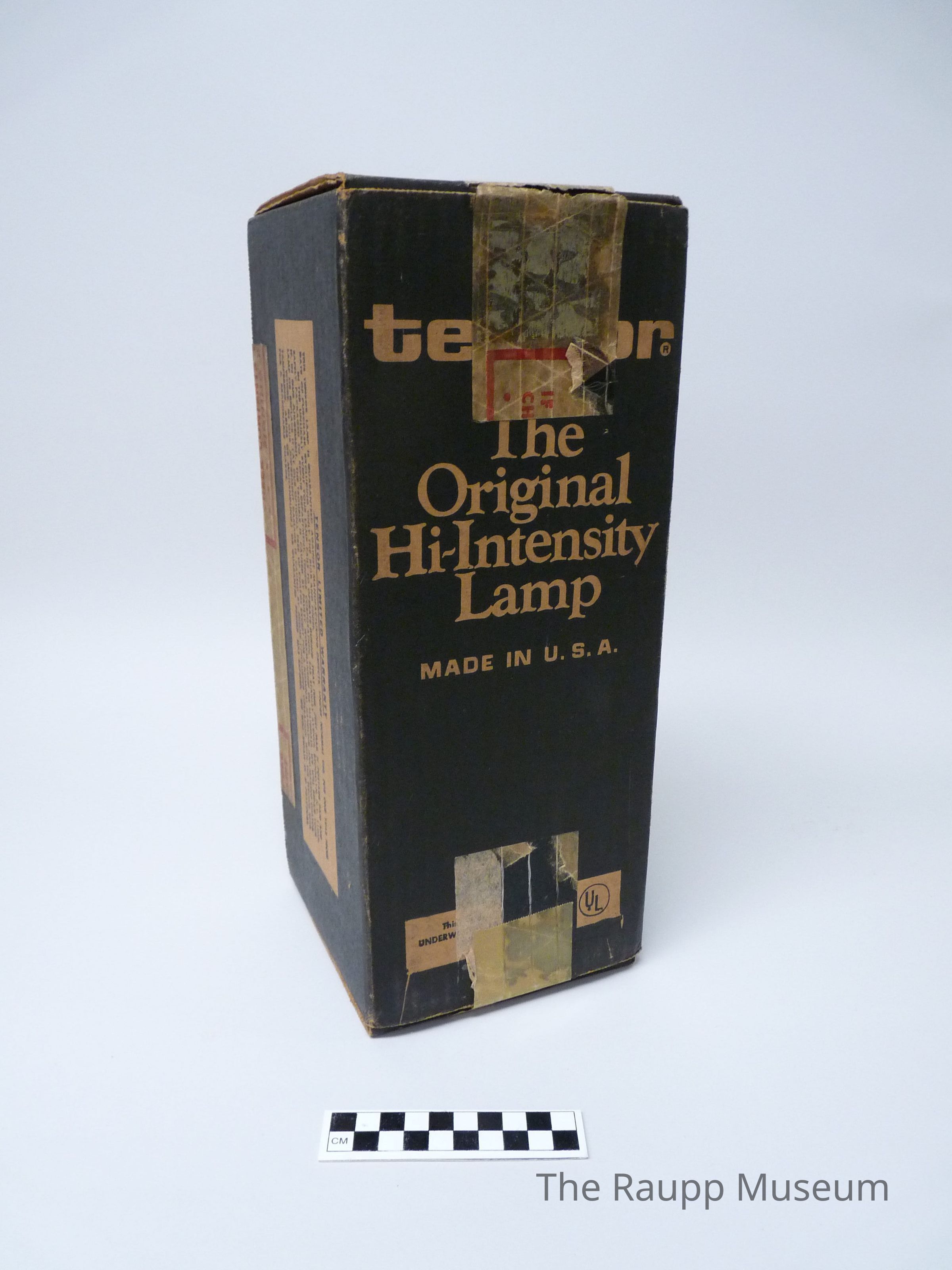 Box: the box is cardboard, black, with brown lettering. There is the lamp title and a warranty information on one side. There is tape on the top and bottom to hold it closed.Material