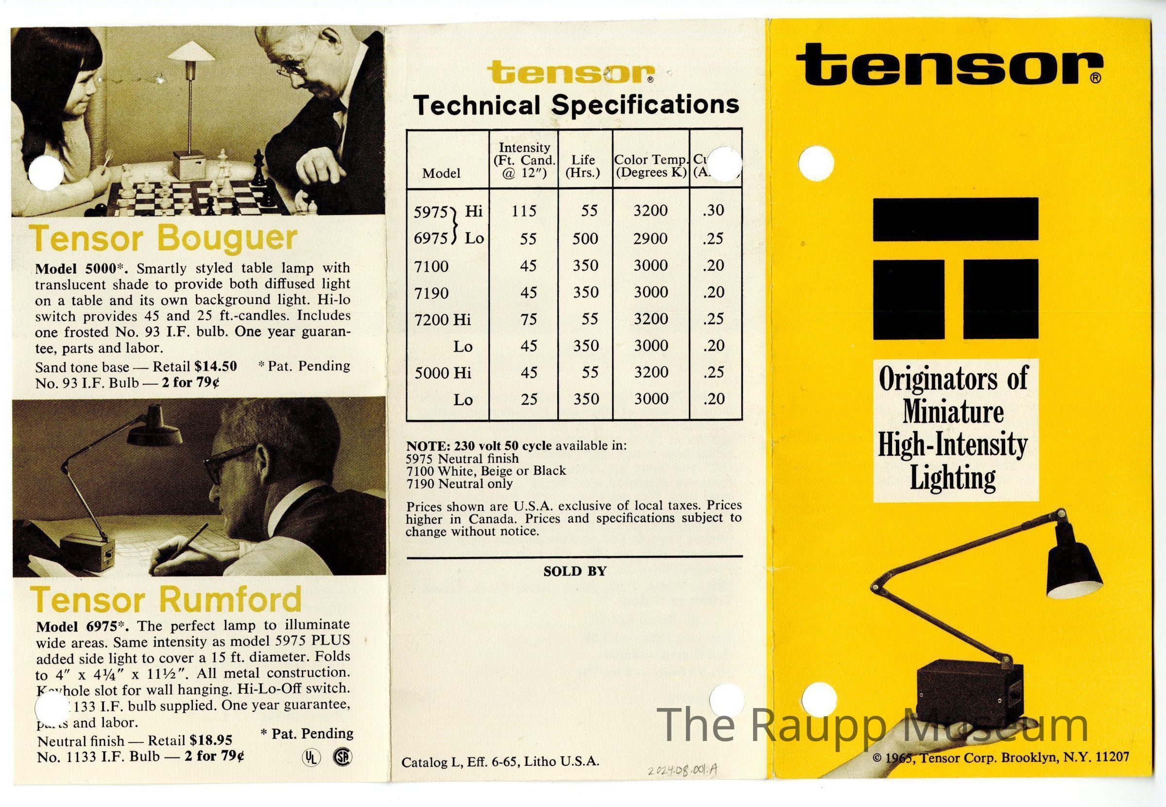 One (1) yellow, black, and white Tensor desk lamp brochure. Brochure is tri-fold, and contains five models with a picture, pricing information, and descriptions for each. On the back is a table with technical specifications for each model. The front cover is yellow with black writing and has a hand holding up a tensor desk lamp in the bottom center.