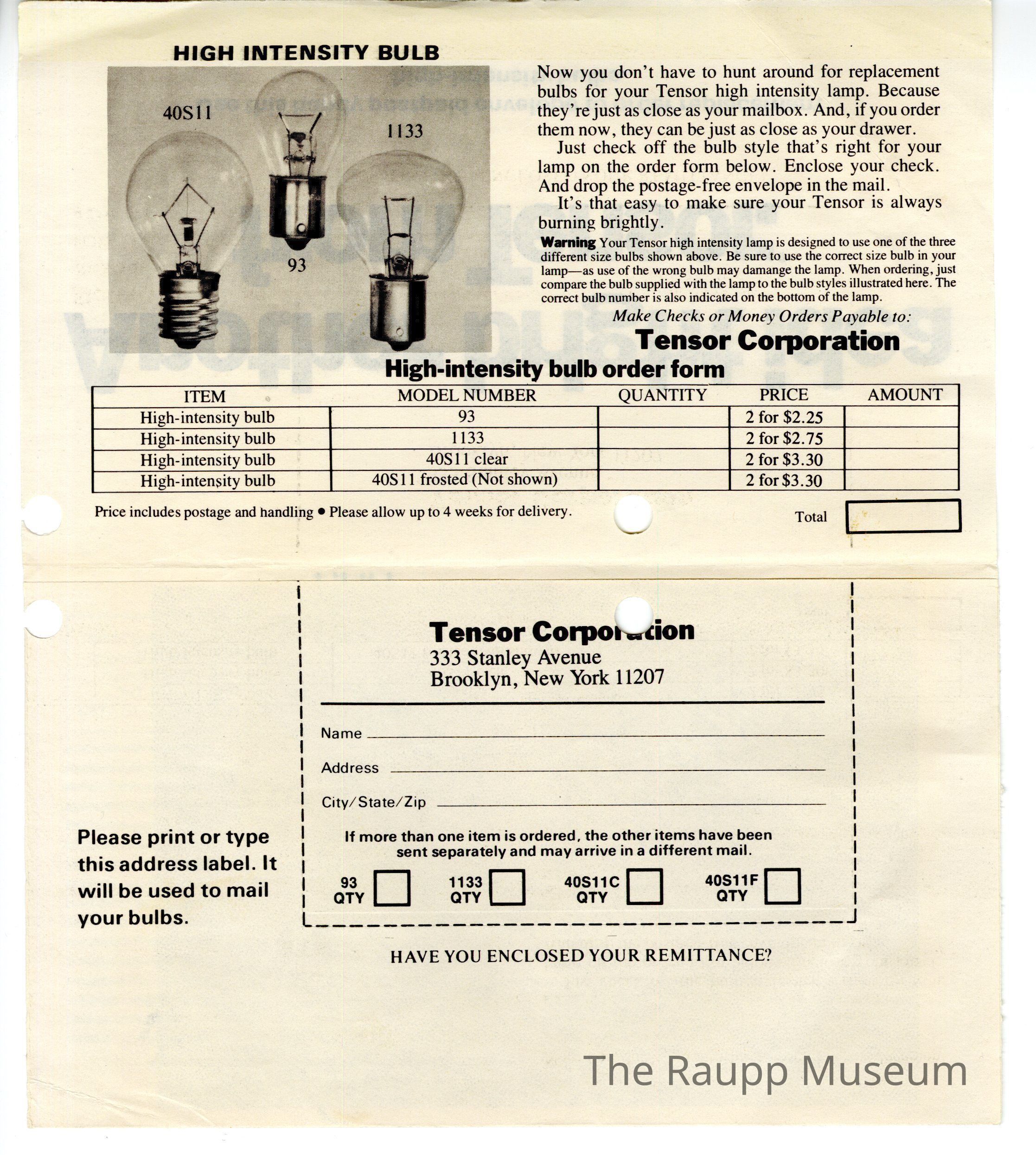 One (1) Tensor lamp light bulb envelope and order form for Tensor high-intensity desk lamps. Brochure is white with black printed text and folded in half into an envelope. On the inside is an order form for more bulbs, and a space to fill our your contact information, and an envelope to place checks or money orders. The back has the address for Tensor Corporation.Archive Details