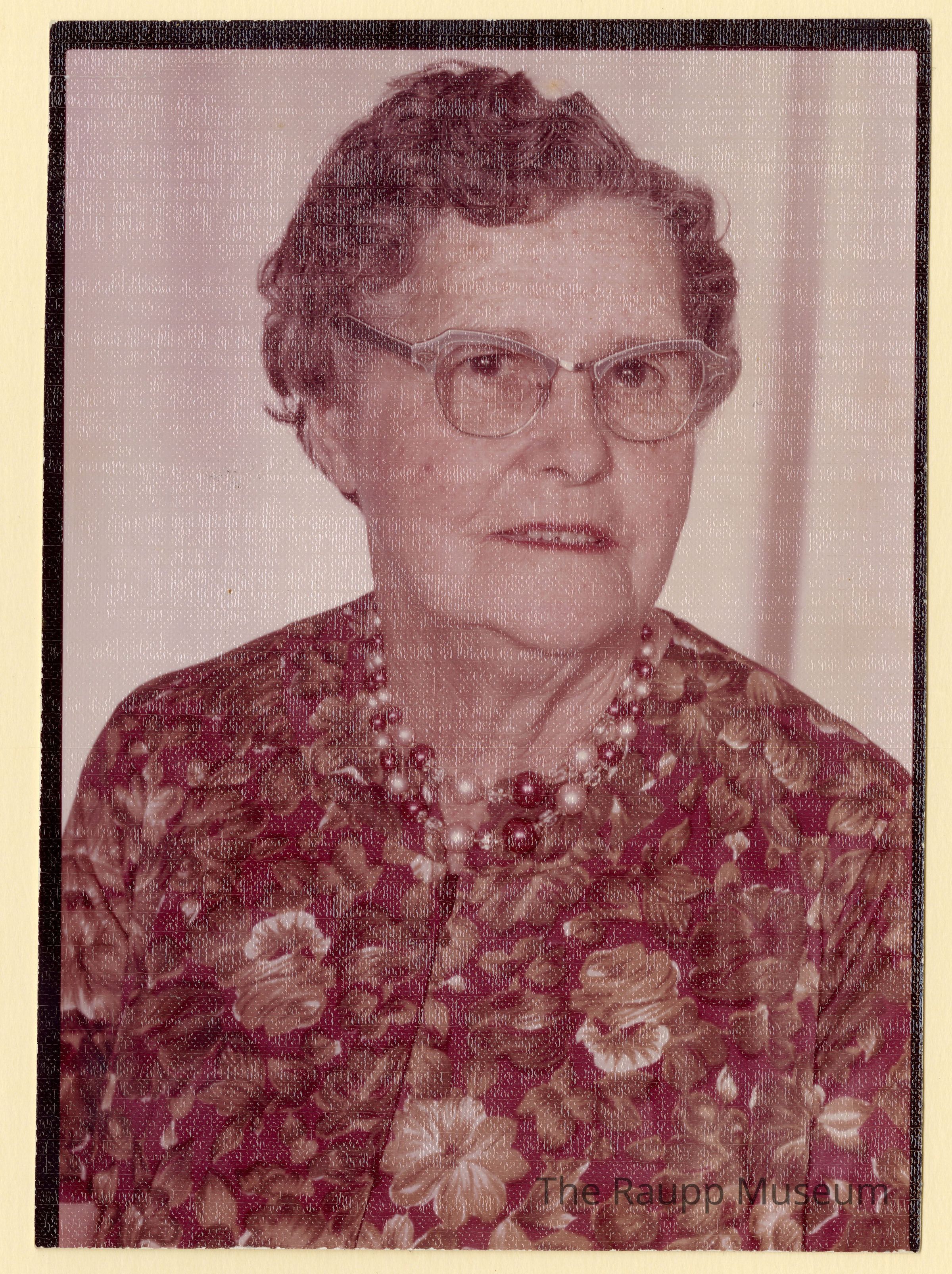 One (1) color portrait photograph of Tess Weidner as a senior. She is wearing a red and brown shirt with flowers all over it, and white and red beaded necklace. She has on white glasses and has short brown and grey hair.
