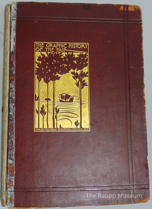 Hardcover book with leather wrapped boards and all edges gilt. Detatched burgundy leather covers. Spine hinges have significant blue/gray adhesive accretion. Front cover title block is gilded, illustration of trees aand a sailing ship. Tan floral pattern pastedowns with ink inscription on front: "E.L. Tinzmann Chicago, Mar. 23, 1950." Contains account of the exhibits at the Columbian Exposition at Chicago in 1893. Black and whtie illustrations and images throughout. 240 numbered pages.