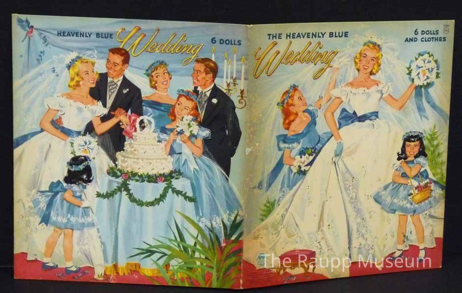 Color paper doll set with folder. Color folder has image of a bride, bridesmaid, and flower girl on a blue background with wedding party on the reverse. Titled: "Heavenly Blue Wedding. Six dolls and clothes." Interior has a dressing room scene with pockets to hold the six paper dolls and their clothing. WIth an array of color paper clothing (most still uncut on sheets) that attaches to the dolls by tabs on the corners.Archive Details
